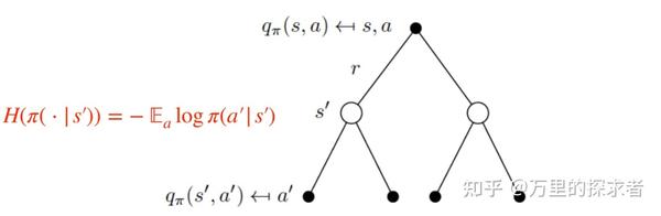 类比一下,可以把$H ((|s^)) \(看作是状态价值函数,把\)(a_{t+1}|s_{t+1} )\(看作动作价值函数,那么:\)$ H ((|s_{t+1}))=-{a{t+1} A}p(a_{t+1}|s_{t+1})(a_{t+1}|s_{t+1} )=-{a{t+1} }(a_{t+1}|s_{t+1} ) $$ 即在一个状态下的熵=在这个状态下对于每一个动作的可能性进行求期望,再反映到回溯图中,就可以看到熵和q是可以写在一起的: