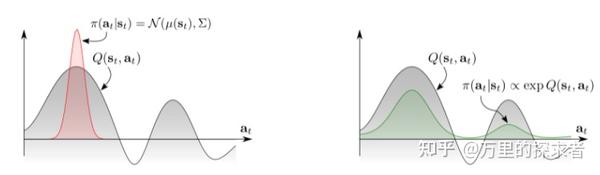 \(Z\)是归一化函数。在上式中,我们先将\(Q^{\pi_{old}}_{soft}\)指数化为\(\exp(\alpha^{-1}{Q^{\pi_{old}}_{soft}})\)再将其归一化为分布\(\frac{\exp \left(Q^{\pi_{\mathrm{old}}}\left(\mathbf{s}_{t}, \cdot\right)\right)}{Z^{\pi_{\text {old }}}\left(\mathbf{s}_{t}\right)}\),其中\(Z^{\pi_{old}}(s_t)=\int \exp(\alpha^{-1}{Q^{\pi_{old}}_{soft}}) da_t\)为归一化函数。我们希望找到一个策略\(\pi \prime\)在状态\(s_t\)下的动作分布与\(\frac{\exp \left(Q^{\pi_{\mathrm{old}}}\left(\mathbf{s}_{t}, \cdot\right)\right)}{Z^{\pi_{\text {old }}}\left(\mathbf{s}_{t}\right)}\)分布的KL-divergence最小 ,即希望\(\pi \prime(\cdot|s_t)\)与分布\(\frac{\exp \left(Q^{\pi_{\mathrm{old}}}\left(\mathbf{s}_{t}, \cdot\right)\right)}{Z^{\pi_{\text {old }}}\left(\mathbf{s}_{t}\right)}\)越相似越好。采用普通的策略优化只会在最高峰满足相似性,而soft策略优化会在整个分布上尽量与价值函数保持相似,不仅保证了赋予动作价值更高的动作更大的概率,还保证了新策略具有较大的熵。过程如下图所示: